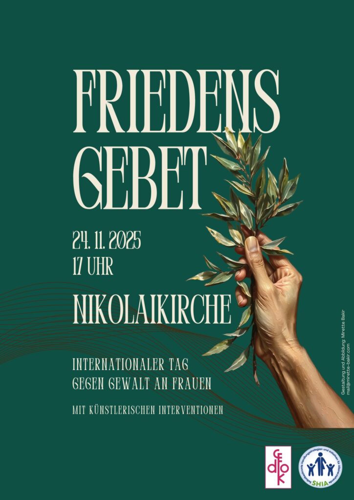 Am 24. November 2025, anlässlich des Internationalen Tags zur Beseitigung von Gewalt gegen Frauen, laden die Künstlerinnenvereinigung GEDOK Mitteldeutschland e.V. und der Landesfamilienverband SHIA e.V. gemeinsam mit der Kirchgemeinde der Nikolaikirche Leipzig sowie vielen weiteren Engagierten, Betroffenen und Verbündeten um 17 Uhr zum Friedensgebet ein.